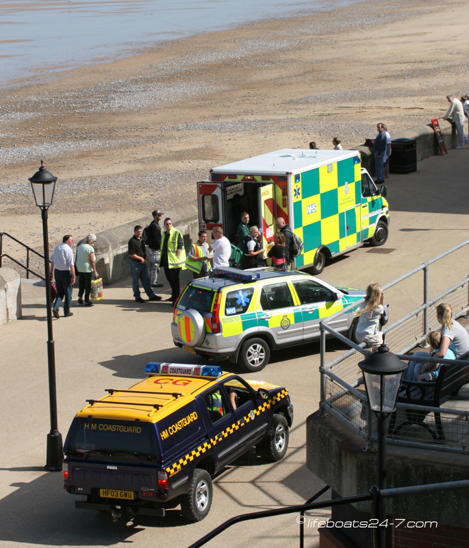 Cromer team members, police officer & casualty walk to ambulance..9.9.06